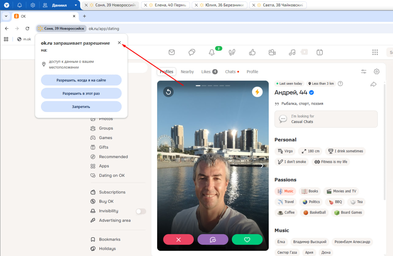 1. Перед відкриттям знайомств ОК - натискаємо на хрестик спливаючого вікна, коли запитує дозвіл на геопозицію.